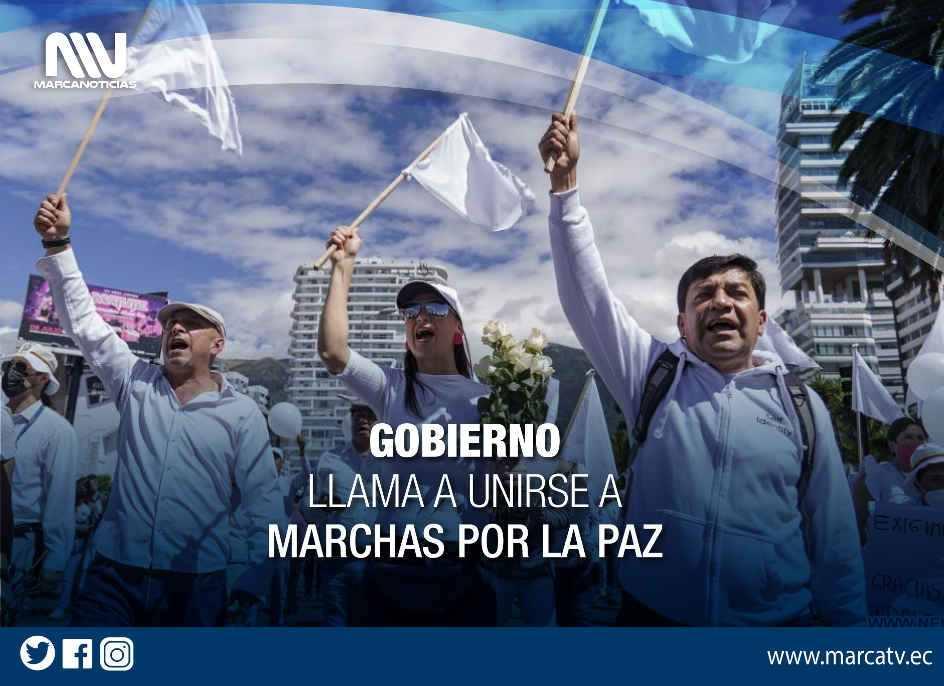 La Secretaría General de Comunicación del Ejecutivo informó este sábado que “respalda esta iniciativa y se suma a esta causa”, por lo que convocó a plegarse a los llamados. “Serán los escenarios de concentración para los ciudadanos que le dicen ¡sí a la paz! Con banderas y camisetas blancas, la ciudadanía hará un llamado a todo el país para que la unidad, el diálogo y la paz imperen en el Ecuador y en su capital”, dice un comunicado oficial.